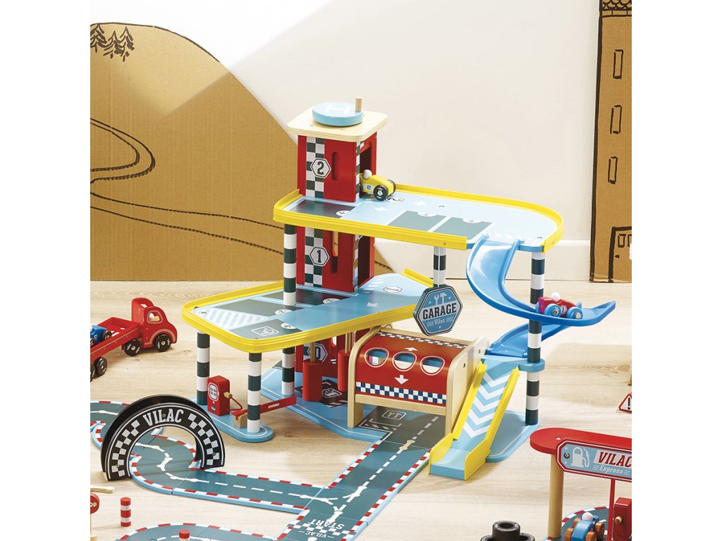 Veľká garáž s rampou, ktorá ponúka množstvo mechanických detailov, najmä výťah, zaťahovacie dvere, parkovaciu závoru, ale aj čerpací stojan, či umývacie kefy. Jej súčasťou je aj dvojica autíčok a helikoptéra. Garáž je súčasťou Vilacity kolekcie a je so všetkými jej súčasťami plne kompatibilná, ďalšie samostatné rozšírenia prinesú variabilitu a prehĺbi zážitok z hry. Výrobok vyžaduje montáž, dodávané s detailným návodom na zostavenie. Hlavné vlastnosti:garáž, 2 autíčka a helikoptéravýťah, zaťahovacie dvere, závora, čerpací stojan a umývacie kefykompatibilná so všetkými súčasťami Vilac Vilacity kolekcievyrobené ekologicky, šetrne k prostrediu V2354 – Veľký závod Vilacity (nie je súčasťou sady, nájdete v našej ponuke): Príklad zostavy garáže s ďalšími súčasťami kolekcie Vilacity:Dodatočné parametre