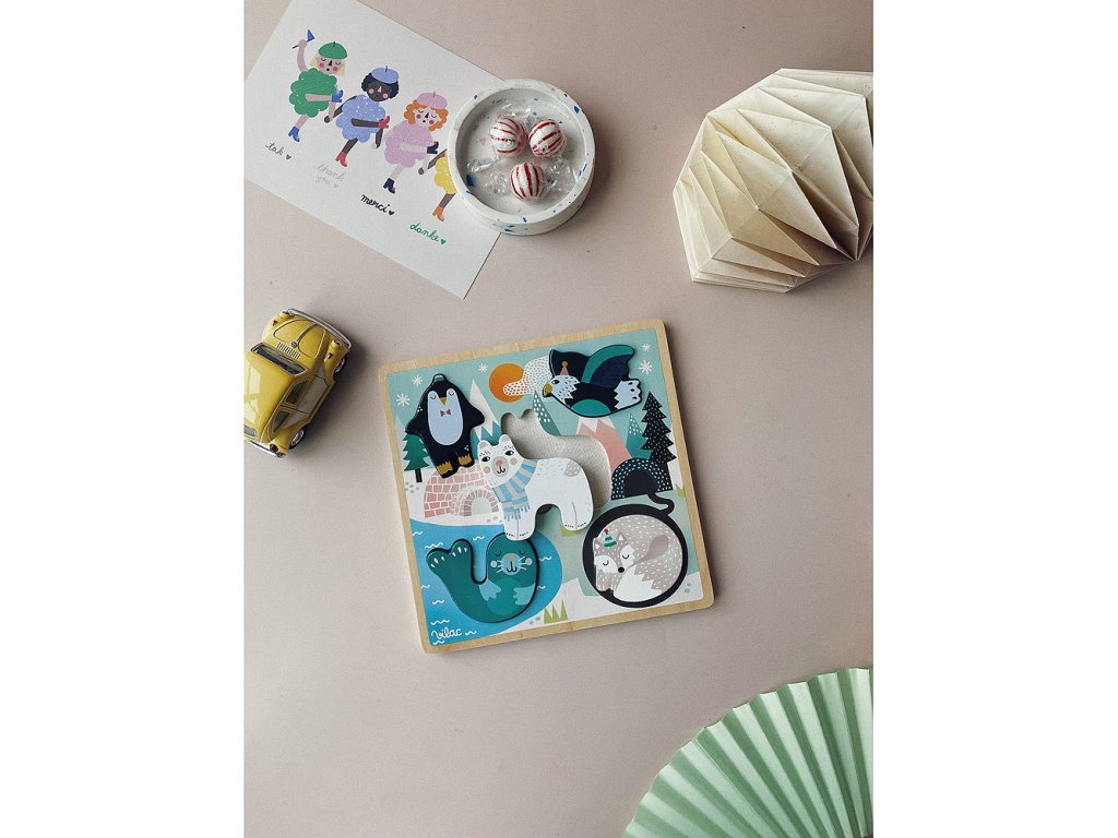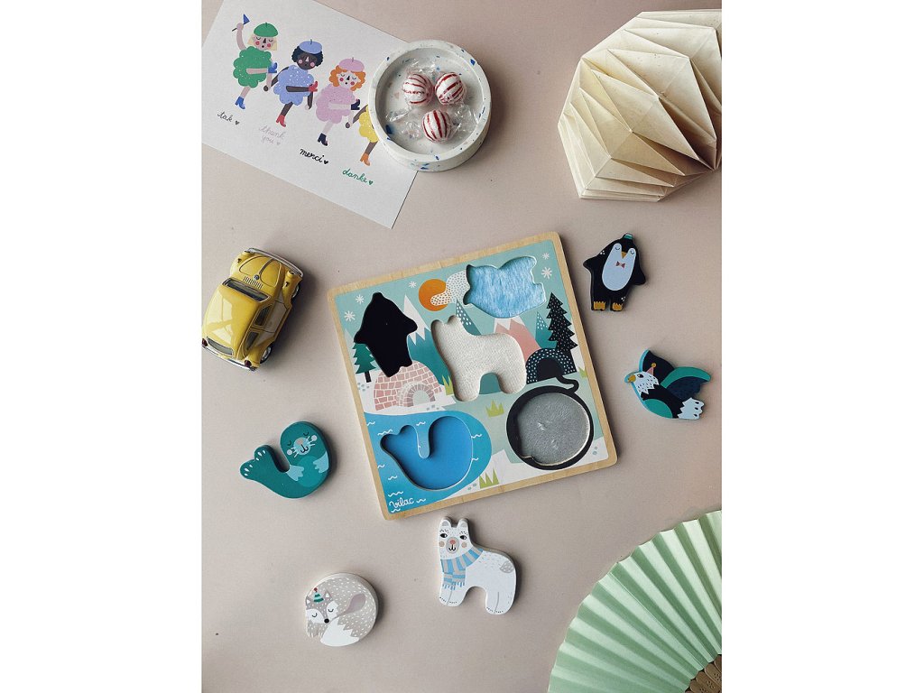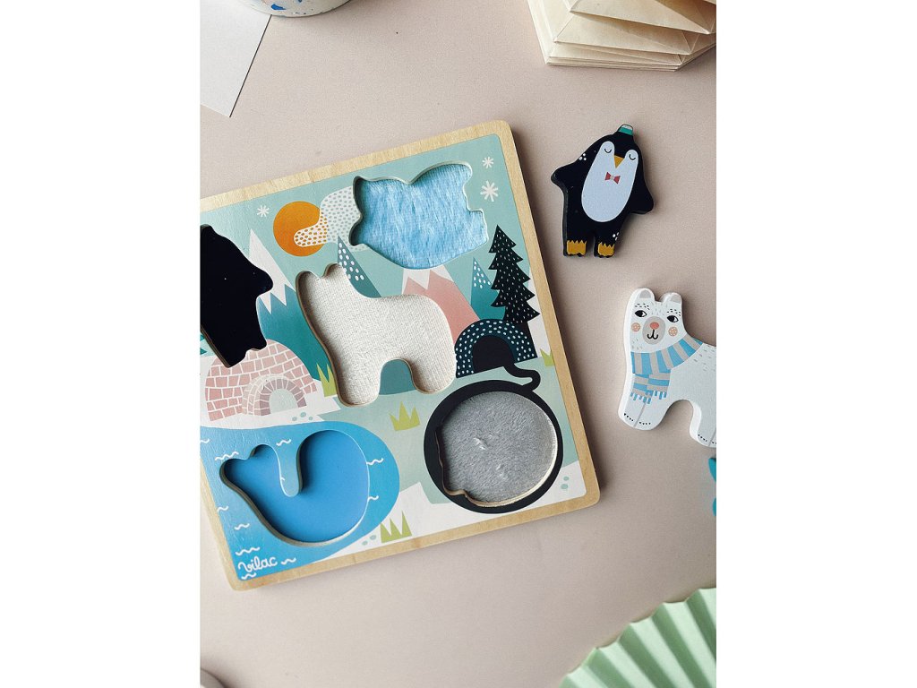 Pekná senzorická skladačka pre deti, celodrevená. Keď deti vyberú dielik z rámčeka, objavia pod ním určitú textíliu, ktorá má pod každým dielikom zvieratka inú štruktúru. Ilustrovala Michelle Carlslund. Hlavné vlastnosti: rozvíja senzomotorickej vlastnosti detídizajn od Michelle Carlslundekologická hračka Cestujte s nami v naivnom a elegantnom svete dánskej ilustrátorky Michelle Carlslund, svete jemných farieb, ktorý je plný roztomilých medveďov a priateľských vtáčikov. V roku 2010, keď Michelle ešte študovala grafický dizajn, vytlačila doma svoje ilustrácie a skúsila ich predať na dizajnovom trhu, kde sa stretli s veľkým úspechom! Niekoľko obchodíkov chcelo začať predávať jej výtvory, a tak ju napadlo, že by bolo fajn začať podnikať. Michelle sa rýchlo stala uznávanou nezávislou ilustrátorkou. Dnes možno jej ekologické grafické diela zakúpiť po celom svete v dizajnových butikoch, papiernictvách a detských obchodoch. Michelle sa inšpiruje všetkým okolo nej. Jej výtvory sú nežné a poetické, štylizovaný a detinský štýl, ktorý sa perfektne prelína s hračkami firmy Vilac. „Som hranolky milujúca, časová optimistka a tvorkyňa ekologických plagátov a ilustrátorka na voľnej nohe so sídlom v dánskej Kodani,“ to by povedala ilustrátorka Michelle Carlslundová, keby sa mala popísať jednou vetou.Dodatočné parametre